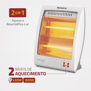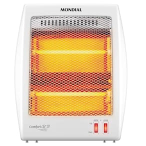 Produto: aquecedor de ambientes 900w 2 em 1 quartzo confort iii - a-16 marca: mondial voltagem: 220vdescrição: com o início da estação mais fria, o aquecedor de ambientes 900w 2 em 1 quartzo confort iii - a-16 da mondial será o maior aliado do seu lar. Multifuncional, ele aquece e desumidifica o ar no ambiente. Possui duas temperaturas, com potências de 450w e 900w, para você regular de acordo com a sua preferência. Vem com lâmpadas de quartzo para um maior aquecimento, desligamento automático em casos de queda e ainda é silencioso. Saiba mais sobre o a-16 da mondial: 2 em 1 além de promover o aquecimento, o a-16 desumidifica o ar no ambiente, garantindo um cômodo quentinho e confortável. 2 níveis de temperaturao aquecedor mondial vem com 2 opções de potência: 450w e 900w. Escolha de acordo com sua preferência Grade protetoraevita contato direto com o sistema de aquecimento, garantindo menos riscos de acidentes. Mais silencioso aquecimento com baixo ruído, ideal para proporcionar noites tranquilas e agradáveis. Lâmpadas de quartzomaior aquecimento com mais conforto. Portátil e compactopode ser colocado em qualquer cômodo da casa, sendo ideal para espaços de até 12m² ou 25m³. Possui alça para transporte, que facilita levar seu aquecedor para qualquer lugar. Mais segurançaequipado com sistema de desligamento automático em caso de queda. Garantia de mais segurança e proteção para a sua família Um ano de garantia mondiala mondial é a escolha de milhões de consumidores. Mondial, a escolha inteligenteespecificações: potência: 900wconsumo de energia: 0,9kwhníveis de potência: 2 níveis - 450w e 900wtipo de aquecimento: lampada quartzodispositivos de segurança: simcor: branco/cinza.Inmetro: sim.
