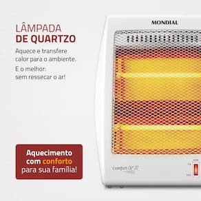 Produto: aquecedor de ambientes 900w 2 em 1 quartzo confort iii - a-16 marca: mondial voltagem: 220vdescrição: com o início da estação mais fria, o aquecedor de ambientes 900w 2 em 1 quartzo confort iii - a-16 da mondial será o maior aliado do seu lar. Multifuncional, ele aquece e desumidifica o ar no ambiente. Possui duas temperaturas, com potências de 450w e 900w, para você regular de acordo com a sua preferência. Vem com lâmpadas de quartzo para um maior aquecimento, desligamento automático em casos de queda e ainda é silencioso. Saiba mais sobre o a-16 da mondial: 2 em 1 além de promover o aquecimento, o a-16 desumidifica o ar no ambiente, garantindo um cômodo quentinho e confortável. 2 níveis de temperaturao aquecedor mondial vem com 2 opções de potência: 450w e 900w. Escolha de acordo com sua preferência Grade protetoraevita contato direto com o sistema de aquecimento, garantindo menos riscos de acidentes. Mais silencioso aquecimento com baixo ruído, ideal para proporcionar noites tranquilas e agradáveis. Lâmpadas de quartzomaior aquecimento com mais conforto. Portátil e compactopode ser colocado em qualquer cômodo da casa, sendo ideal para espaços de até 12m² ou 25m³. Possui alça para transporte, que facilita levar seu aquecedor para qualquer lugar. Mais segurançaequipado com sistema de desligamento automático em caso de queda. Garantia de mais segurança e proteção para a sua família Um ano de garantia mondiala mondial é a escolha de milhões de consumidores. Mondial, a escolha inteligenteespecificações: potência: 900wconsumo de energia: 0,9kwhníveis de potência: 2 níveis - 450w e 900wtipo de aquecimento: lampada quartzodispositivos de segurança: simcor: branco/cinza.Inmetro: sim.