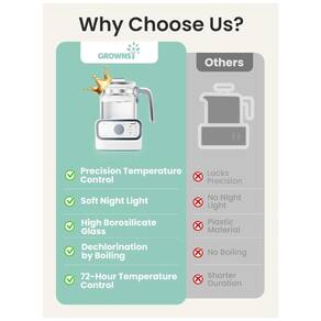 Chega de esperar para aquecer as mamadeiras Simplesmente despeje a água morna do aquecedor instantâneo GROWNSY em sua garrafa, pegue a fórmula e agite. Substitui os Aquecedores de Biberões Tradicionais. Controle de temperatura preciso com temporizador 0 100 C 0 212 F Controle de temperatura, construído em sonda de detecção de semicondutor e sonda externa de controle de temperatura NTC. Aquecedor instantâneo perfeito com temporizador para fórmula, café e chá. Merece ser propriedade de famílias em crescimento. Aquecimento constante Mantenha quente o dia e a noite até secar. Alimentação a qualquer momento para evitar que o bebê chore. Equipado com LEDs brilhantes que indicam que a chaleira está aquecendo. O aquecedor instantâneo desliga automaticamente quando a água seca. Função de fervura como chaleira elétrica O aquecedor instantâneo ferverá a água rapidamente e estará pronto para uso para chá, aveia, café, macarrão e muito mais. 1.3L Grande Capacidade perfeito para toda a sua família. Design elegante O visor LCD e a luz noturna tornam a operação noturna mais aliviada e segura. Feito com material de segurança PP de grau alimentício, vidro à prova de explosão e aço inoxidável que proporciona uma vida mais saudável para você Marca: Não Informado