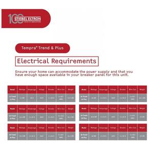 Equipado com display LED e materiais em cobre, o aparelho suporta vazão de 11,4 L/min. Mede 42,2 cm de largura por 36,8 cm de altura, com capacidade mínima de 1,5 L e pressão máxima de 10,3 bar. Requer serviço elétrico dedicado de 240 V ou 208-240 V, com consumo máximo de 28.800 W em 240 V ou 21.600 W em 208 V.