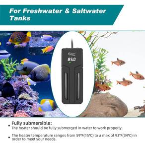 Totalmente submersível: o aquecedor é totalmente submersível. Observe que o aquecedor deve ser totalmente submerso para funcionar adequadamente. Rápido acúmulo térmico: a haste de aquecimento é feita de material de vidro de quartzo à prova de explosão e um fio de aquecimento de níquel-cromo resistente a altas temperaturas com condução de calor de carboneto de silicone; que resulta em aquecimento mais rápido da água e um aquecedor mais seguro, mais durável e duradouro. Visor de temperatura digital LED inteligente embutido: a tela de exibição digital LED mostra a temperatura da água atual e predefinida. O controle manual externo facilita a configuração e a operação. Cada prensa muda a temperatura definida em -17 °C. O LED pisca 5 segundos e depois para, indicando que a temperatura foi definida e a tela mostra a temperatura atual. - Aquecimento rápido: aquecimento mais rápido em segundos, o material do aquecedor é de vidro de quartzo à prova de explosão e os materiais do fio de aquecimento de níquel-cromo têm maior eficiência energética térmica e, em seguida, conduzem o calor através do material de carboneto de silicone, são mais seguros e duráveis de usar. Capa de plástico resistente a altas temperaturas, não deforma facilmente e tem resistência à corrosão muito forte - Economia de energia com frequência: reduz automaticamente a energia ao se aproximar da temperatura definida, aquecendo a 10% a 30% de energia, utiliza totalmente a inércia de energia térmica para alcançar suavemente a temperatura definida, economizando energia. O controlador externo é fácil de operar, cada prensa muda a temperatura definida em -17.2 °C, varia de 15.0 °C (15 ?) a um máximo de 34 °C para atender às suas necessidades - Termostato inteligente: a proteção contra sobretemperatura evita "cozinhar peixe". Quando a temperatura da água excede cerca de 35 °C, o código de número 95 piscando, luz vermelha e verde piscam juntos; e acima de 34 °C, o aquecedor parará de aquecer automaticamente. Quando a temperatura da água esfriar abaixo de 34 °C, o aquecedor começará a funcionar automaticamente - Proteção anti-seco: sensor inteligente de temperatura, quando o aquecedor é exposto ao ar, exibe o código de falha ER e o aquecedor desligará automaticamente. Quando a haste de aquecimento estiver completamente imersa em água, ela começará a funcionar automaticamente. Prolonga efetivamente a vida útil. Tem uma função de memória de desligamento e não é necessário configurá-lo novamente - Forte desempenho de segurança: Visor digital de temperatura LED inteligente. Três sondas de temperatura embutidas, monitoramento em tempo real da temperatura da água, precisão de temperatura de -17 °C. Suporte de ventosa forte, pode fixar o aquecedor de forma estável em todos os cantos do aquário. Adequado para água doce e salgada