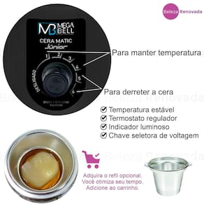 Aquecedor De Cera Quente Panela Termocera Depilação 400GDescriçãoA CERA MATIC JÚNIOR pertence à Linha CERA MATIC MEGA BELL, uma linha de aquecedores profissionais de cera em barra para depilação, com design moderno e diversas opções de cores. Derrete e armazena a cera na temperatura ideal. Nela, podem ser utilizadas ceras em tabletes ou granuladas, deixando o trabalho muito mais rápido e eficiente. Aquecedor profissional ou doméstico para cera de depilação. Equipado com termostato para regulagem de temperatura, indicador luminoso de funcionamento e chave seletora de voltagem. Seu corpo de ABS é resistente à altas temperaturas, e sua resistência blindada, a torna totalmente segura.