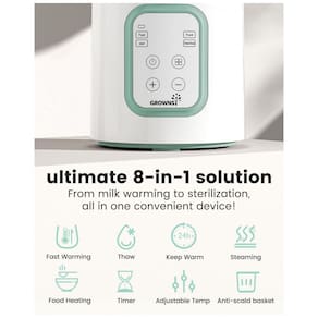 Em apenas 3 minutos, 120ml de leite atingem 37°C no Aquecedor de Mamadeira GROWNSY, acalmando rapidamente o bebê. Com 8 funções em 1, aquece, descongela, mantém quente, esteriliza e aquece alimentos. Com ajuste de tempo e temperatura, cesta antiescaldo e desligamento automático. Perfeito para mamadas noturnas, facilitando a vida das mamães. Sua praticidade e eficiência tornam-no ideal para famílias em crescimento. Presenteie com o melhor aquecedor do mercado e deixe o Grownsy cuidar do resto.