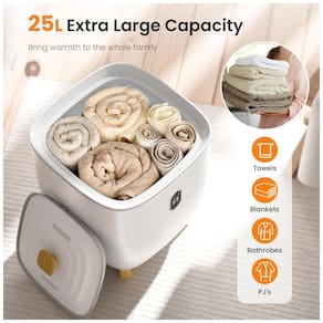 Aquecedor de Toalhas Extra Grande de 25L – Este aquecedor eletrostático para banheiro possui um design espaçoso de 25L, acomodando facilmente toalhas de banho grandes, cobertores, roupões e pijamas. Perfeito para toda a família, proporcionando um envolvimento quente e luxuoso o ano todo.
