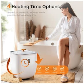 Design Amigável ao Usuário – Projetado com conveniência em mente, o aquecedor de toalhas de banho tem configurações de temperatura baixa e alta para atender às suas preferências. A tampa superior inclui uma bandeja para adicionar fragrâncias relaxantes, enquanto o painel inteligente de exibição torna a operação simples e intuitiva.