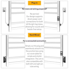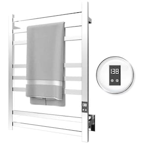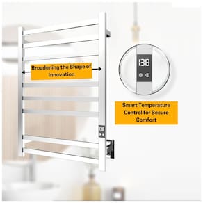 Aquecedor de toalhas em aço inox 304 com 160W de potência, aquece até 8 toalhas, timer automático para segurança e eficiência. Opções de instalação e painel LED.