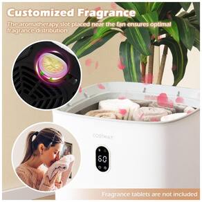 Com uma capacidade espaçosa de 35 litros, este aquecedor é perfeito para atender às necessidades de toda a família. Ele pode acomodar até 4 toalhas grandes de 114 x 177 cm, e o interior do balde possui ganchos para secar itens pequenos, como meias e roupas íntimas. A bandeja inferior para aromaterapia permite adicionar uma fragrância relaxante enquanto suas toalhas esquentam, proporcionando uma experiência de spa em casa.