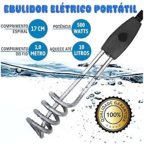 Composição: Plástico e ferro Dimensões: Aprox. 16?cm (comprimento) x 4?cm (largura) Potência: 500?W Conteúdo da embalagem: 01 Ebulidor Elétrico Ferve Água