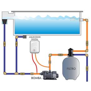 - 1 Aquecedor para Piscina Digital Parafusos e buchas para instalação 2 Engates Flexíveis 1 Kit Instala Fácil contendo 2 Niples ½”BSP 1 Gabarito de Furação Manual de Instruções