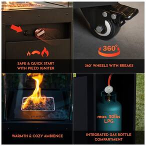 Montar e desfrutar deste aquecedor é simples e rápido. Com rodas e proteções de vidro à prova de vento, você pode facilmente movê-lo pelo seu espaço e garantir sua estabilidade. Além disso, o Faro é equipado com recursos de segurança avançados, incluindo desligamento automático em caso de inclinação ou queda, sensor termoelétrico que interrompe o fornecimento de gás se a chama se apagar e um botão de ignição protegido contra acesso não autorizado.