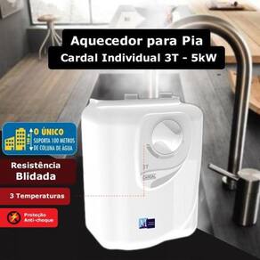 Possui resistência Blindada e por isso tem maior durabilidade 3 Opções de Temperatura Sem complicações, o Aquecedor é instalado diretamente no ponto de uso, sem a necessidade de extensas tubulações de água quente, comum nos sistemas de aquecimento central O único que suporta até 100 metros de coluna d'água Carcaça em plástico de engenharia com fibra de vidro: maior resistência e durabilidade Elemento de fixação reforçados: evita vazamentos Com a chave de fluxo é possível consumir energia somente quando o registro for aberto Compatível com aquecimento solar Compatível dispositivo D.R. Resistências independentes Aprovado pelo INMETRO Baixo consumo de energia Informações técnicas: Marca: Cardal Cor: Branco Modelo: Aquecedor Individual 3T Tipo de aquecedor: Individual Temperaturas: 3 Energia de Alimentação: 220 Volts Potência: 5000 Watts Fiação Mínima: 4mm² Pressão de funcionamento: Mínima: 20 kPa (2 m.C.A.) Máxima: 100 kPa (100 m.C.A.) Disjuntor: 25 A Altura 22 cm Largura 10 cm Comprimento 15 cm Material em plastico