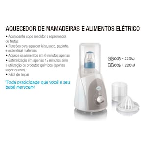 Aquecedor De Mamadeira Elétrico 3 Em 1 110v - Bb005 Aquecedor de Mamadeiras Elétrico Multifuncional Funções para aquecer leite, papinha, suco e esterilizar materiais Aquece os alimentos em aproximadamente 6 minutos Esterilização em apenas 12 minutos sem utilização e produtos químicos Esterilização feita com vapor quente Design sofisticado e moderno que permite uma fácil limpeza Acompanha copo medidor e espremedor de frutas Itens Inclusos: 1 Aquecedor de Mamadeira 110V 1 Suporte 1 Copo 1 Copo Medidor 1 Espremedor 1 Tampa Ean: 7898506470204