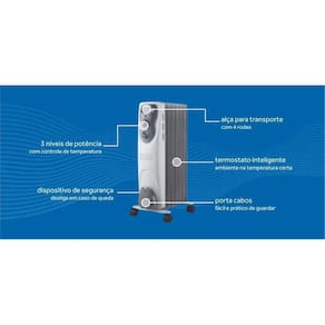 Aquecedor Térmico Domestico a Óleo Ventisol 127V 1500W -Fabricante: Ventisol -Modelo: AO-01 127V -Dimensões Altura: 63,5cm Largura: 34cm Comprimento:24cm -Termostato Inteligente: Mantém o ambiente na temperatura desejada -Potência: Três níveis de potência e controle das temperaturas ajustável Indicação de Uso: Luz fica ligada enquanto o produto está em uso -Facilidade de transporte: Possui 4 rodas e porta cabo, podendo ser levado para outros ambientes Ean: 7898461962493
