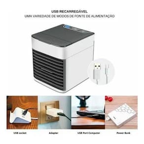 Especificações: Marca: Ultra; Modelo: Air Cooler; Capacidade do tanque de água: 370 ml; Criar uma zona de resfriamento pessoal: Sim; Resfria a temperatura ambiente pessoal até 6-8 graus; Silencioso: Sim; Ventos velocidade: 3 modos Alto/Médio/Baixo Funcionamento: Até 6 ate 8 horas; Baixo consumo: Energia; Modo de usar: Basta adicionar água e ligá-lo; Desligamento automático: Quando acaba a agua; Potência: 10 w; Dimensões: 17,2 cm X 14,5 cm x 16,5 cm