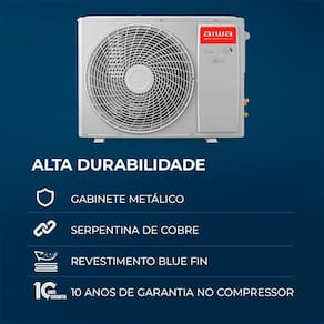 Alta durabilidade: Gabinete metálico, serpentina de cobre, revestimento Blue Fin e 10 anos de garantia no compressor;