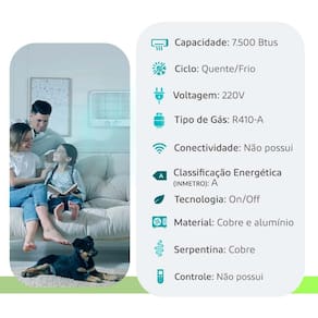 Selo Procel - classificação A de energia nos modelos de 7.500 e 10.000 BTU/h. Fluido Refrigerante Ecológico R410-A que é atóxico, não inflamável e não agride a camada de ozônio. Serpentina em cobre. Sistema de renovação de ar: Deixa o ar mais puro e saudável. Duas velocidades: baixa e alta + modo ventilação.