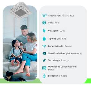 Ar Condicionado Split Cassete 4 Vias - Inverter R-32 - Hisense - 36.000 BTUs - Frio - 220V Monofásico Ar-Condicionado Cassete 4 Vias – Conforto, Conectividade e Desempenho Profissional O Ar-Condicionado Cassete 4 Vias foi desenvolvido para entregar climatização de alta performance em ambientes amplos e modernos. Ideal para escritórios, comércios e espaços corporativos, ele combina tecnologia, eficiência e design sofisticado, garantindo conforto térmico, economia e praticidade no dia a dia. Fluxo de ar circular em 360° Com distribuição de fluxo de ar em 360 graus, o Cassete 4 Vias garante uma circulação uniforme e eficiente, alcançando todos os cantos do ambiente. Esse sistema proporciona conforto térmico equilibrado, sem zonas de calor ou frio excessivo, criando uma sensação agradável em qualquer posição da sala. Conectividade total com Wi-Fi integrado A tecnologia Wi-Fi ConnectLife permite controlar o ar-condicionado a qualquer hora e de qualquer lugar. Basta acessar o aplicativo, selecionar o modo desejado e ajustar temperatura, fluxo de ar e funções especiais com apenas alguns toques no celular ou na TV. Praticidade e controle na palma da mão. Display de LED oculto e design elegante O display de LED oculto facilita a visualização da temperatura ambiente de forma discreta e moderna. Quando o aparelho está em modo de espera, o visor permanece apagado, acendendo automaticamente apenas quando ativado. Um detalhe que adiciona sofisticação e harmonia estética ao ambiente. Fácil limpeza e manutenção inteligente O filtro lavável pode ser facilmente removido e limpo com água, mantendo o desempenho e a qualidade do ar. Sua grade única com design inovador em hexágonos permite instalação e manutenção simples, oferecendo versatilidade e praticidade no uso diário. Amplo direcionamento de ar para máximo conforto Com oscilação da aleta de até 88°, o Cassete 4 Vias oferece ampla distribuição de ar, alcançando todas as áreas do ambiente. Essa amplitude garante um fluxo de ar refrescante e uniforme, ideal para espaços que exigem climatização constante e equilibrada. A solução ideal para ambientes amplos e modernos Com design inteligente, conectividade avançada e desempenho superior, o Ar-Condicionado Cassete 4 Vias é a escolha perfeita para quem busca climatizar grandes espaços com eficiência, conforto e elegância. Uma solução completa que une tecnologia, economia e bem-estar em cada detalhe.