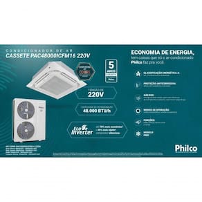 O Ar-Condicionado Split Cassete Philco Eco Inverter 48000 BTU é ideal para quem busca climatização potente, silenciosa e econômica. Com design discreto e instalação embutida no teto, integra-se facilmente a qualquer ambiente, sendo perfeito para espaços amplos como escritórios, consultórios e lojas. Equipado com tecnologia inverter, oferece maior eficiência e estabilidade térmica, além do gás R32, que é ecológico. Possui funções como Dormir, Turbo, Silêncio, Timer, Oscilação Automática e Auto Restart, além de controle remoto com display de cristal líquido, filtro anti-bactéria e painel de fácil limpeza. Conforto, desempenho e sustentabilidade em um só produto.