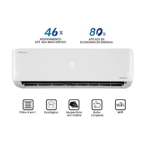 A conectividade Wi-Fi, através do aplicativo Connect Life, permite controlar o ar-condicionado de qualquer lugar, ajustando a temperatura ou ligando e desligando o aparelho remotamente. O dispositivo é compatível com Google Assistant e Alexa, possibilitando comandos de voz para maior praticidade. O modo super assegura um resfriamento 46% mais rápido, criando um ambiente fresco e confortável rapidamente. Com classificação A do INMETRO e uso do fluido R32, o Hisense Inverter Hi-Wall alia economia e sustentabilidade, contribuindo para a preservação do planeta.
