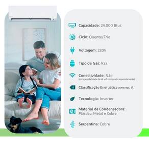 Ar Condicionado Split Hi Wall - Inverter R-32 - Full - Daikin - 24.000 BTUs - Quente/Frio - 220V Monofásico Split Hi Wall R-32 Daikin – O Ar-Condicionado Que Une Economia, Conforto e Tecnologia O Split Hi Wall R-32 Daikin é a escolha ideal para quem quer mais conforto no dia a dia sem abrir mão de economia e qualidade. Combinando eficiência energética, climatização inteligente e cuidado com a saúde do ar, ele traz a confiança de uma marca globalmente reconhecida por sua tecnologia em climatização.  Mais conforto com menos consumo O segredo está no compressor Inverter, que mantém a temperatura estável sem os gastos extras dos sistemas convencionais. O modelo também conta com motor Neodymium, que ajuda a reduzir o consumo de energia mesmo em dias mais quentes. Climatize seu ambiente de forma inteligente, com menor impacto na conta de luz.  Alta eficiência garantida Com Classificação A no INMETRO e o Selo Procel Ouro, o Split Hi Wall R-32 Daikin entrega até 50% mais eficiência energética do que modelos similares. É desempenho com economia de verdade.  Respire ar mais puro Além de climatizar, este ar-condicionado cuida do ar que você respira. O Filtro Tela retém partículas maiores, enquanto o Filtro Silver Ion atua na purificação do ar, ajudando a eliminar impurezas e microrganismos. Ideal para quem tem crianças, idosos ou sofre com alergias.  Durável e resistente A unidade externa do aparelho foi projetada para durar mais, mesmo em condições difíceis. Com aletas tratadas com Blue Fin, o equipamento ganha resistência extra contra corrosão causada por maresia, poluição e umidade. Uma solução confiável para diferentes regiões e climas.  Climatização silenciosa Você quase nem percebe que ele está ligado. O funcionamento silencioso da unidade interna e externa garante um ambiente mais tranquilo para dormir, trabalhar ou relaxar.  Controle inteligente sob demanda Para quem busca mais praticidade, o modelo é compatível com controle via aplicativo, permitindo ajustes à distância, de acordo com a sua rotina.  Importante: este produto não possui Comando de Voz e Wi-Fi integrado. Para liberar as funções de conectividade remota, é necessário adquirir o módulo Wi-Fi separadamente.    Tecnologia que cuida da sua rotina, do seu bolso e do seu ar. O Split Hi Wall R-32 Daikin é tudo o que você precisa para transformar o seu ambiente com conforto e eficiência.