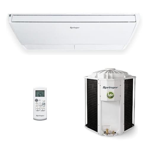 A linha Split Teto Springer é ideal para estabelecimentos comerciais, trazendo maior conforto térmico, operação silenciosa e robustez aliado a um design moderno e agradável. Possui condensadora leve, compacta e robusta, com descarga vertical, que ocupa menos espaço e facilita a instalação e manutenção, e possui serpentina em cobre que garante maior vida útil, confiabilidade e robustez. Evaporadora fácil de limpar, com filtro de tela lavável de simples acesso. Disponível nas capacidades 24.000, 36.000 e 57.000 BTU/h Frio.