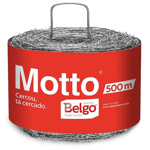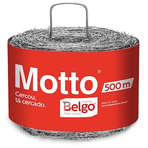 Arame Farpado Motto 500 MO Arame Farpado Motto da Belgo pode ser encontrado com um tamanho de 500 metros e é utilizado na construção de cercas de contenção, garantindo uma cerca mais esticada e que garante a redução da quantidade necessária de mourões e estacas (madeiras de canto e dos intervalos da cerca).Esse produto é desenvolvido com uma tecnologia que tem três vezes mais zinco para ter mais durabilidade em sua construção e prevenir corrosões causadas pelas ações do tempo. O Arame Farpado Motto é reconhecido por ser muito resistente, principalmente contra os impactos de animais.Conheça esse produto e experimente a qualidade do Arame Farpado Motto ESPECIFICAÇÕESTamanho500 mComprimento500 mZincagemCamada pesada (3x mais zinco)Carga de impacto350 kgfDiâmetro dos fios1,60 mmDistância entre as farpas125 mmTorção dos fiosAlternadaAcabamentoGalvanizado à Fogo
