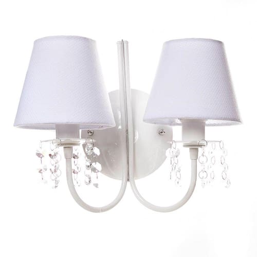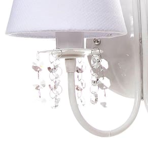 Ter uma iluminação indireta, além da central, deixa o quartinho do bebê mais versátil. Aposte no charme luminotécnico que esta arandela pode propocionar e impressione com este item de decoração encantador. Dados TécnicosArandela para 2 lâmpadas em alumínio com pintura epóxi, decorada com cristais e cúpulas forradas com tecido. Lâmpadas SuportadasEconômicas / Led: Qualquer LâmpadaIncandescente amarela : Até 60w por Soquete MedidasLargura: 30 cmAltura: 25 cm
