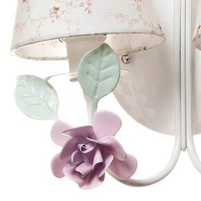Ter uma iluminação indireta, além da central, deixa o quartinho do bebê mais versátil. Aposte no charme luminotécnico que esta arandela pode propocionar e impressione com este item de decoração encantador. Dados TécnicosArandela para 2 lâmpadas em alumínio com pintura epóxi, decorada com 2 flores de metal com folhas e cúpulas forradas com tecido. Lâmpadas SuportadasEconômicas / Led: Qualquer LâmpadaIncandescente amarela : Até 60w por Soquete MedidasLargura: 30 cmAltura: 25 cm
