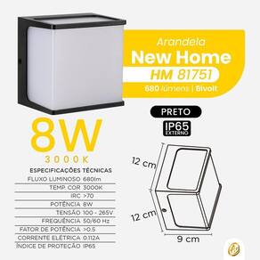 Cor: Preto Temperatura de cor: 3000K - Branco Quente Fluxo luminoso: 680lm IRC: 70 Potência: 8W Frequência: 50/60Hz Fator de Potência: 0.5 Corrente máxima: 0.112A Tensão: 100-240V Temperatura de operação: 0C a 40C Angulo: 90 IRC: 70 Grau de Proteção: IP65 indicado para áreas externas Peso: 270g Dimensões: 120x120x90mm