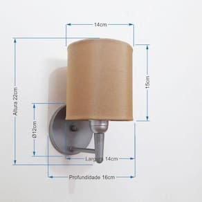 Arandela Cilindrica Md-2009 Base Cinza Cúpula Em Tecido 14x15cm Palha - Bivolt Arandela de parede Cilindrica Md-2009 Base Cinza Cúpula em Tecido 14x15cm PalhaAs arandelas Lustres Vivare são elementos versáteis e elegantes que podem transformar qualquer ambiente em um espaço cheio de estilo. Seja para adicionar uma iluminação suave, destacar uma parede ou criar um efeito de luz diferenciado.Dimensão:Cúpula em Tecido: 14x15cm Arandela de parede Montada: Altura 22cm Largura 14cm Profundidade 16cm Formato: Cilíndrico Tamanho: Pequeno Especificação:Material: Cúpula em Tecido Estrutura em Alumínio Base Parede: Diâmetro 11x1,2cm Resistente: Á Maresia Voltagem: 110V/220V Liga e Desliga: Não Tipo de Soquete: E27 Lâmpada Utilizada: Led Bulbo Até 16w ou Fluorescente Espiral Até 25w Cada Capacidade de Lâmpadas: 1 Observação:Acompanha Lâmpada: Não Possui Led Integrado: Não Garantia: 12 Meses Manual de Instalação: Sim Arandela de parede Montada: Sim Controle de Luminosidade: Não Tipo de Embalagem: Caixa Conservação e Manutenção do Produto:A Limpeza deve ser realizada com o produto desligado. Remova o lustre que pode ser lavado com sabão neutro. Nunca utilize produtos químicos e abrasivos Dica:Antes de comprar o seu produto verifique as medidas, o local onde pretende instalar e se necessário o serviço de um profissional qualificado.