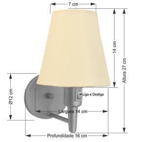 Arandela Cone Md-2013 Cinza C/ Inter Liga E Desl Cúpula Em Tecido Algodão Crú - Bivolt Arandela de parede Cone Md-2013 Cinza C/ Inter Liga e Desl Cúpula Tecido Algodão CrúAs arandelas Lustres Vivare são elementos versáteis e elegantes que podem transformar qualquer ambiente em um espaço cheio de estilo. Seja para adicionar uma iluminação suave, destacar uma parede ou criar um efeito de luz diferenciado.Dimensão:Cúpula em Tecido: 14x07x14cm Arandela de parede Montada: Altura 27cm Largura 14cm Profundidade 16cm Formato: Cone Tamanho: Pequeno Especificação:Material: Cúpula em Tecido Estrutura em Alumínio Base Parede: Diâmetro 11x1,2cm Resistente: Á Maresia Voltagem: 110V/220V Liga e Desliga: Interruptor no Soquete Tipo de Soquete: E27 Tipo de Lâmpada: Led Bulbo até 16w ou Fluorescente Espiral até 25w Cada Capacidade de Lâmpadas: 1 Observação:Acompanha Lâmpada: Não Possui Led Integrado: Não Garantia: 12 Meses Manual de Instalação: Sim Arandela de parede Montada: Sim Controle de Luminosidade: Não Tipo de Embalagem: Caixa Conservação e Manutenção do Produto:A Limpeza deve ser realizada com o produto desligado. Remova o lustre que pode ser lavado com sabão neutro. Nunca utilize produtos químicos e abrasivos Antes de comprar o seu produto verifique as medidas, o local onde pretende instalar e se necessário o serviço de um profissional qualificado.