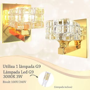 Arandela Cristal K9 Quadrado Dourado Brilhoso Bet39 + Led