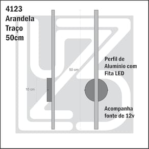Descrição Técnica: - Modelo: ARANDELA TRAÇO 50CM - Acabamento: Pintura a pó - Material: Alumínio e Silicone - Tamanho do perfil com LED (LxAxP): 50 x 10 x 2cm - Tamanho do acabamento de fixação: 10 (diâmetro) x 2cm - Interruptor: Não - LED: Fita LED de 12v integrada de aproximadamente 5w - Bivolt: Sim - Acompanha Fonte para fita LED