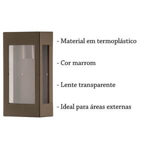 - Materiais: Termoplástico Estrutura - Cor: Marrom - Lente: Transparente - Medidas Altura: 25 cm Comprimento: 12,5 cm Profundidade: 8 cm - Bivolt - Soquete: E27 - Exclusivo uso de lâmpada Led - Corrente: 4A - Potencia: 20w - Tensão: 127/220 - Resistente à maresia