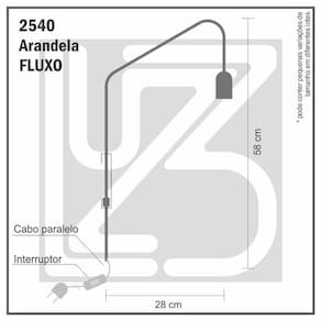 Arandela Fluxo - Cobre Arandela em curva modelo Fluxo. Com seus 58 cm de altura se adapta a diversas situações. Possui um giro de 180 graus podendo ser direcionada conforme sua necessidade. Fácil instalação com cabo paralelo e chave liga e desliga no próprio fio. As lâmpadas utilizadas são as compatíveis com soquete E27, podendo ser lâmpadas bulbo ou dicroica. Descrição Técnica: - Modelo: ARANDELA FLUXO - Acabamento: Pintura a pó térmica - Quantidade de soquetes: 1 - Material: Tubo em Alumínio - Tamanho (AxC): 58 cm x 28 cm - Cabo: Cabo paralelo com interruptor deslizante e plug injetado - Soquete: Padrão E27 com revestimento na cor COBRE - Bivolt: Sim **Lâmpadas vendidas separadamente**