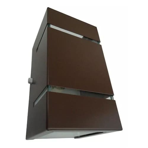 Arandela Frisos Parede Muro Externa Interna 1318M - Marrom Arandela Parede Muro com Frisos Externo Interno. Arandela de parede e muro com 2 frisos e 2 fachos, ideal para ser Utilizado em área externa, interna e maresia. Com pintura eletrostática, fabricada em alumínio não enferruja. Usa 1 lâmpada de led de até 9w ou halopim de até 40w. Dimensões Do Produto: 8 largura x 8 profundidade x 15 altura. Material: alumínio e vidro. Ean: 7890104230983 Marca: Não Informado