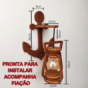 Arandela luminária lustre lampião âncora 110/220 v kit 4 pç Crie inove e encante A nossa linha de móveis não para de crescer e agora traz para você, esta linda peça para organizar diversos ambientes da casa. Esta peça com certeza vai deixar a sua casa mais bonita Luminária lampião âncora rustico, fabricado em mdf e pintado a mão. Envernizado deixando um acabamento envelhecido perfeito. Bom para iluminar e decorar ambientes como áreas de garagem, churrasco, garagens com bar, casa, chácara decorar festas, lanchonetes, casa de campo, pousadas. Especificações técnicas Acompanha fiação Acompanha fiação Características: - dimensões: - diâmetro base 13 cm - altura lampião 28 cm - altura base parede 40 cm - peso do produto 2 kg - bocais 1 - kit sim - material: mdf medium density fiberboard - mdf ecologicamente correto com certificado fsc de alta qualidade - cor: mogno, tabalo - nível de instalação: fácil - de 90 dias contra defeitos de fabricação Conteúdo da embalagem: - soquetes sim - base para parede sim - fios sim 45 cm regulável - lâmpadas não Atenção: Todos os nossos produtos são feitos à mão e nos esforçamos para lhe entregar o mais rápido possível. Antes de comprar Os objetos decorativos não acompanham o produto A voltagem depende da lâmpada 100/220 v Acompanha as lampadas As lâmpadas não acompanham o produto Marca: Não Informado