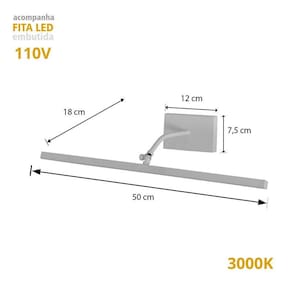 Modelo : Camarim Cor es : Dourado Material : Alumínio Base Canopla : 12 x 7,5 cm Iluminação : Fita de LED Temperatura : 3000K Branco Quente Voltagem : 127V Medida : 14 x 7 x 50 cm Peso : 400g Conteúdo da embalagem : 1 Luminária de Parede