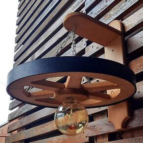 Luminária roda de carroça replica rustico, fabricado em mdf e pintado a mão. Envernizado deixando um acabamento envelhecido perfeito.