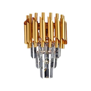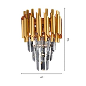 Especificações gerais do produto Dimensões AxLxP (mm): 330x220x120Cor: DouradoMaterial: Alumínio, Cristal e MetalGarantia: 1 ano junto ao fabricanteReferência: LA-001MVoltagem: BivoltLocal de Uso: InternoLâmpada Inclusa: NãoNúmero de Lâmpadas: 2Potência Máxima (por soquete): 40WSoquete: E14 O que acompanha o produto 1 Arandela