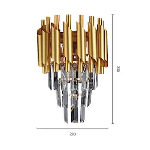 Especificações gerais do produtoDimensões AxLxP mm : 330x220x120Cor: DouradoMaterial: Alumínio, Cristal e MetalGarantia: 1 ano junto ao fabricanteReferência: LA-001MVoltagem: BivoltLocal de Uso: InternoLâmpada Inclusa: NãoNúmero de Lâmpadas: 2Potência Máxima por soquete : 40WSoquete: E14O que acompanha o produto1 Arandela