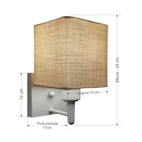 Arandela Quadrada Md-2006 Branco Cúpula Em Tecido Palha - Bivolt Arandela de parede Quadrada Md-2006 Branco Cúpula em Tecido Palha - BivoltAs arandelas Lustres Vivare são elementos versáteis e elegantes que podem transformar qualquer ambiente em um espaço cheio de estilo. Seja para adicionar uma iluminação suave, destacar uma parede ou criar um efeito de luz diferenciado.Dimensão:Cúpula em Tecido: 15x14x14cm Arandela de parede Montada: Altura 24cm Largura 14cm Profundidade 17cm Formato: Quadrado Tamanho: Pequeno Especificação:Material: Cúpula em Tecido Estrutura em Alumínio Base Parede: Quadrado 12x12x2cm Resistente: Á Maresia Voltagem: 110V/220V Liga e Desliga: Não Tipo de Soquete: E27 Lâmpada Utilizada: Led Bulbo Até 16w ou Fluorescente Espiral Até 25w Cada Capacidade de Lâmpadas: 1 Observação:Acompanha Lâmpada: Não Possui Led Integrado: Não Garantia: 12 Meses Manual de Instalação: Sim Arandela de parede Montada: Sim Controle de Luminosidade: Não Tipo de Embalagem: Caixa Conservação e Manutenção do Produto:A Limpeza deve ser realizada com o produto desligado. Remova o lustre que pode ser lavado com sabão neutro. Nunca utilize produtos químicos e abrasivos Dica:Antes de comprar o seu produto verifique as medidas, o local onde pretende instalar e se necessário o serviço de um profissional qualificado.