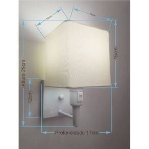 Arandela de parede Quadrada Md-2019 Branca C/ Inter Liga e Desl Cúpula Tecido Algodão CrúAs arandelas Lustres Vivare são elementos versáteis e elegantes que podem transformar qualquer ambiente em um espaço cheio de estilo. Seja para adicionar uma iluminação suave, destacar uma parede ou criar um efeito de luz diferenciado.Dimensão:Cúpula em Tecido: 15x14x14cm Arandela de parede Montada: Altura 29cm Largura 14cm Profundidade 17cm Formato: Quadrado Tamanho: Pequeno Especificação:Material: Cúpula em Tecido Estrutura em Alumínio Base Parede: Quadrado 12x12x2cm Resistente: Á Maresia Voltagem: 110V/220V Liga e Desliga: Interruptor no Soquete Tipo de Soquete: E27 Lâmpada Utilizada: Led Bulbo Até 16w ou Fluorescente Espiral Até 25w Cada Capacidade de Lâmpadas: 1 Observação:Acompanha Lâmpada: Não Possui Led Integrado: Não Garantia: 12 Meses Manual de Instalação: Sim Arandela de parede Montada: Sim Controle de Luminosidade: Não Tipo de Embalagem: Caixa Conservação e Manutenção do Produto:A Limpeza deve ser realizada com o produto desligado. Remova o lustre que pode ser lavado com sabão neutro. Nunca utilize produtos químicos e abrasivos Dica:Antes de comprar o seu produto verifique as medidas, o local onde pretende instalar e se necessário o serviço de um profissional qualificado.