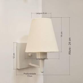 Arandela Quadrada Md-2034 Branco Cúpula Em Tecido Cone Algodão Crú - Bivolt Arandela de parede Quadrada Md-2034 Branco Cúpula em Tecido Cone Algodão Crú - BivoltAs arandelas Lustres Vivare são elementos versáteis e elegantes que podem transformar qualquer ambiente em um espaço cheio de estilo. Seja para adicionar uma iluminação suave, destacar uma parede ou criar um efeito de luz diferenciado.Dimensão: Cúpula em Tecido: 14x07x14cm Arandela de parede Montada: Altura 24cm Largura 14cm Profundidade 17cm Formato: Quadrado / Cone Tamanho: Pequeno Especificação: Material: Cúpula em Tecido Estrutura em Alumínio Base Parede: Quadrado 12x12x2cm Resistente: Á Maresia Voltagem: 110V/220V Liga e Desliga: Não Tipo de Soquete: E27 Lâmpada Utilizada: Led Bulbo Até 16w ou Fluorescente Espiral Até 25w cada Capacidade de Lâmpadas: 1 Observação: Acompanha Lâmpada: Não Possui Led Integrado: Não Garantia: 12 Meses Manual de Instalação: Sim Arandela de parede Montada: Sim Controle de Luminosidade: Não Tipo de Embalagem: Caixa Conservação e Manutenção do Produto: A Limpeza deve ser realizada com o produto desligado. Remova o lustre que pode ser lavado com sabão neutro. Nunca utilize produtos químicos e abrasivos Dica: Antes de comprar o seu produto verifique as medidas, o local onde pretende instalar e se necessário o serviço de um profissional qualificado.