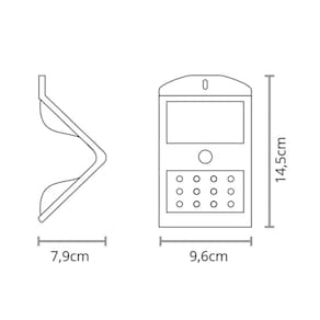 - Acabamento / funcionalidades: Branco; LED Integrado; Ativação por sensor de presença; Instalação rápida e fácil; Tempo de carga: 8h; 2 modos de operação; Durante o dia a arandela permanece desligada