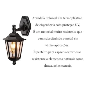 Nós da Acende a Luz procuramos trazer o que há de mais atual e moderno no mundo da Iluminação priorizando sempre a qualidade. Procuramos não apenas atender às suas necessidades, mas superar expectativas. Assim estabelecendo uma relação de confiança Nossa missão é garantir a satisfação total dos nossos clientes. Arandela Lup40 Colonial em termoplástico de engenharia com proteção UV, é um material muito resistente que vem substituindo o metal em várias aplicações. É perfeito para espaços externos e resistente a elementos naturais como chuva, sol e maresia. Tem capacidade para uma lâmpada E27. A lente por ser transparente pode ser Utilizado lâmpadas bulbo comuns ou lâmpadas de filamento retro. -- Neste kit contém: - 01 Arandela Lup40 Colonial em termoplástico de engenharia - 01 Lâmpada Ali48 Filamento Led 4w Vintage E27 ST64 Âmbar Descrição: - Materiais: Termoplástico de engenharia e Poliestireno Cristal - Cor: Estrutura: Preto - Medidas: Altura Total: 40 cm Profundidade : 24 cm Largura: 18 cm Base ou canopla que fixa no teto Comprimento : 13 cm Altura: 16 cm - Tensão: 127-220V - Soquete: E27 - Potência máxima: 20W - Proteção UV - Não desbota ou fica quebradiço ao longo do tempo Descrição lâmpada: Lâmpada Filamento Vintage Led E27 Industrial Vidro Âmbar Decorativa 4W - Soquete: E27 - Potência: 4W - ST64 - Temperatura de cor: 2200K luz quente - Durabilidade: 15.000 horas - Tensão: 100-240V - Fluxo luminoso: 400lm - Frequência: 50-60 Hz - Grau de proteção: IP20