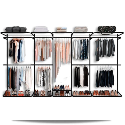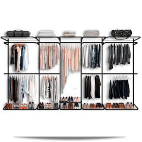 Este produto possui uma configuração unissex, contendo cabideiro com dois níveis e cabideiro para longos. As prateleiras / maleiros pontuam os módulos fazendo o perímetro, assim como as sapateiras na parte inferior. Você poderá brincar com as peças intercambiando entre módulos.