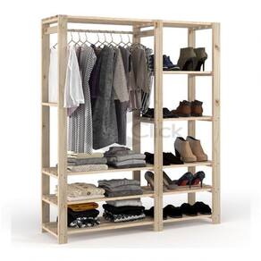 Estante arara com prateleiras e estrutura em madeira maciça de Pinus.