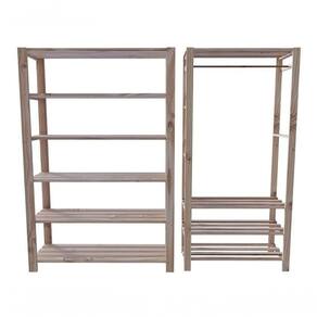 Estante arara com prateleiras e estrutura em madeira maciça de Pinus.