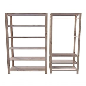 Estante arara com prateleiras e estrutura em madeira maciça de Pinus.